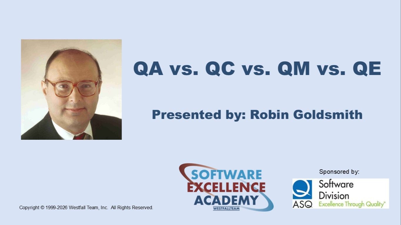QA vs. QC vs. QM vs. QE presented by Robin Goldsmith